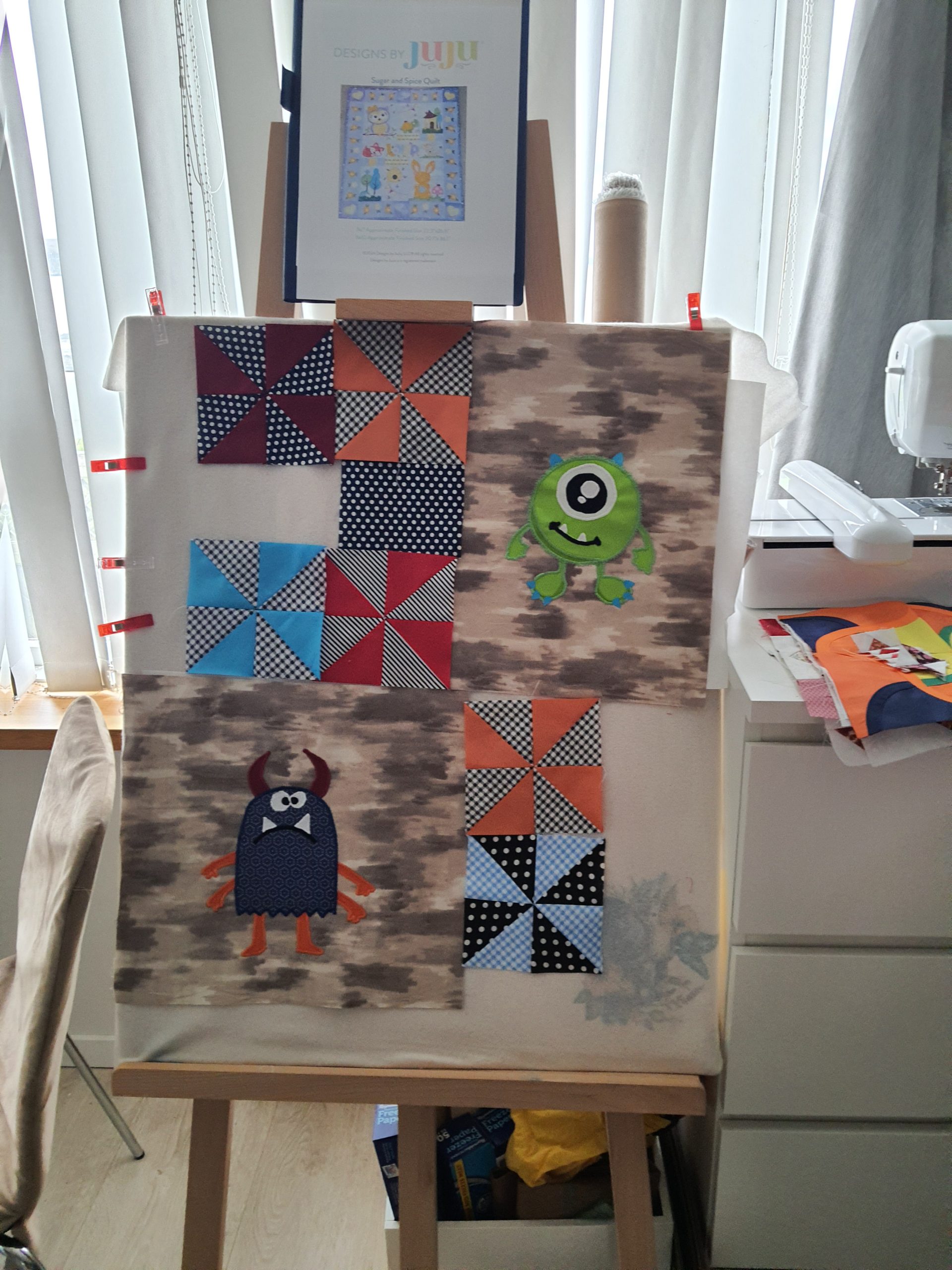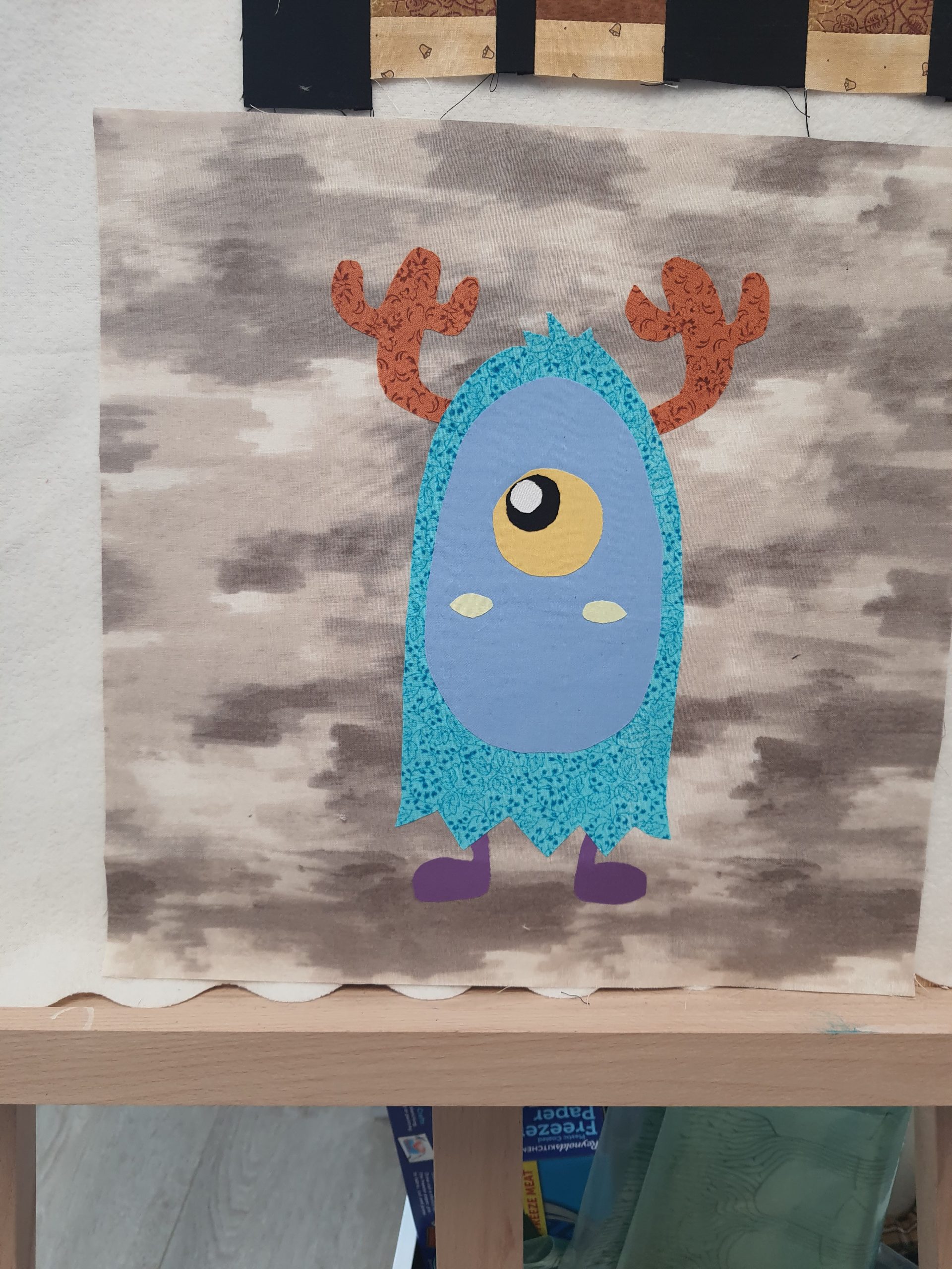 Smátt og smátt vann ég svo í að sauma skrímslin á bakgrunnin, ýmist með satín saum eða ýmsum mismunandi skrautsporum sem saumavélin mín bípur upp á.