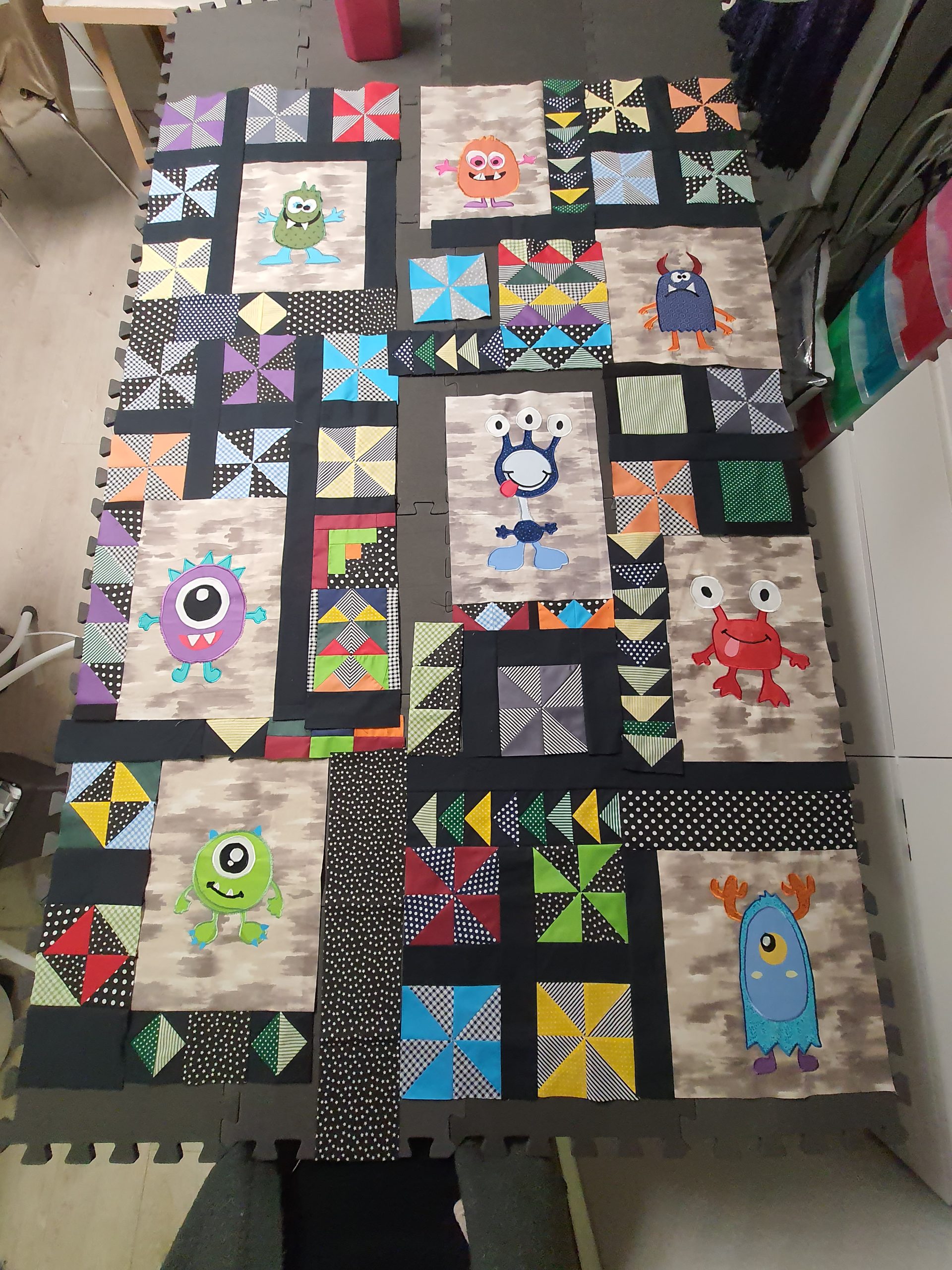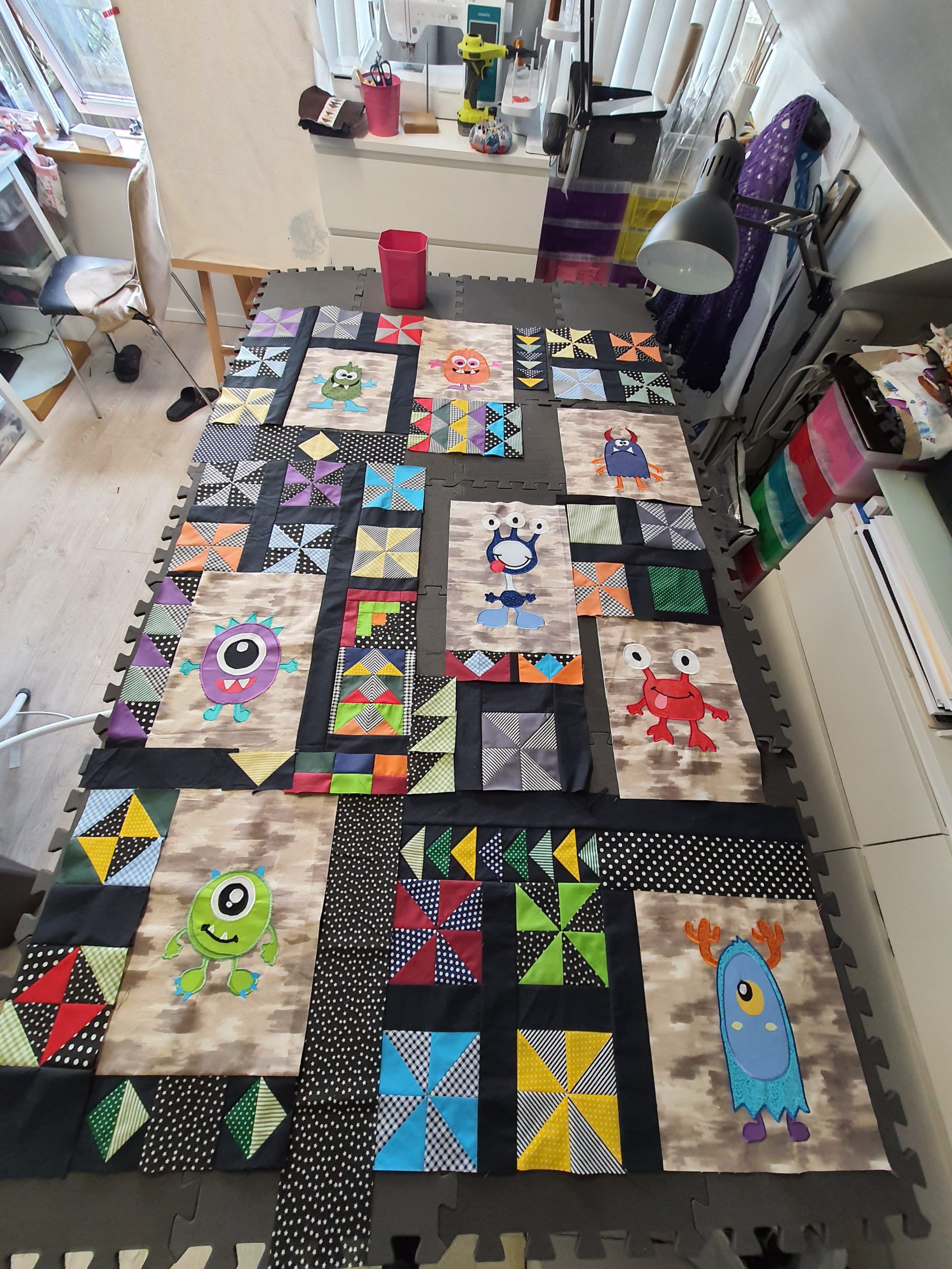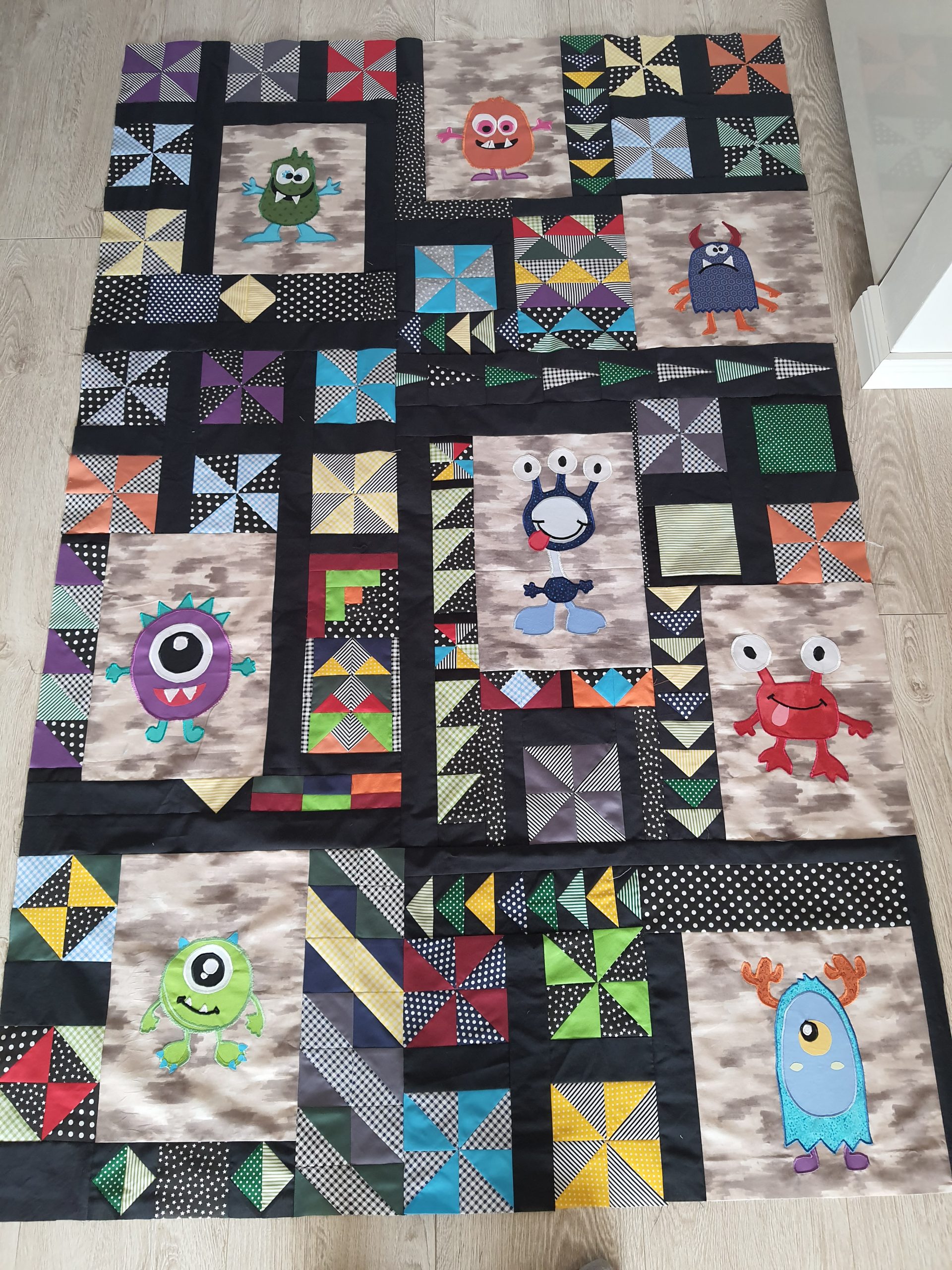 Ég byrjaði á þessu teppi í maí síðastliðum, eða þ.e.a.s. á einni blokk.  Ég var samt búin að prennta út myndir af skrímslum sem ætlunin var að nota.