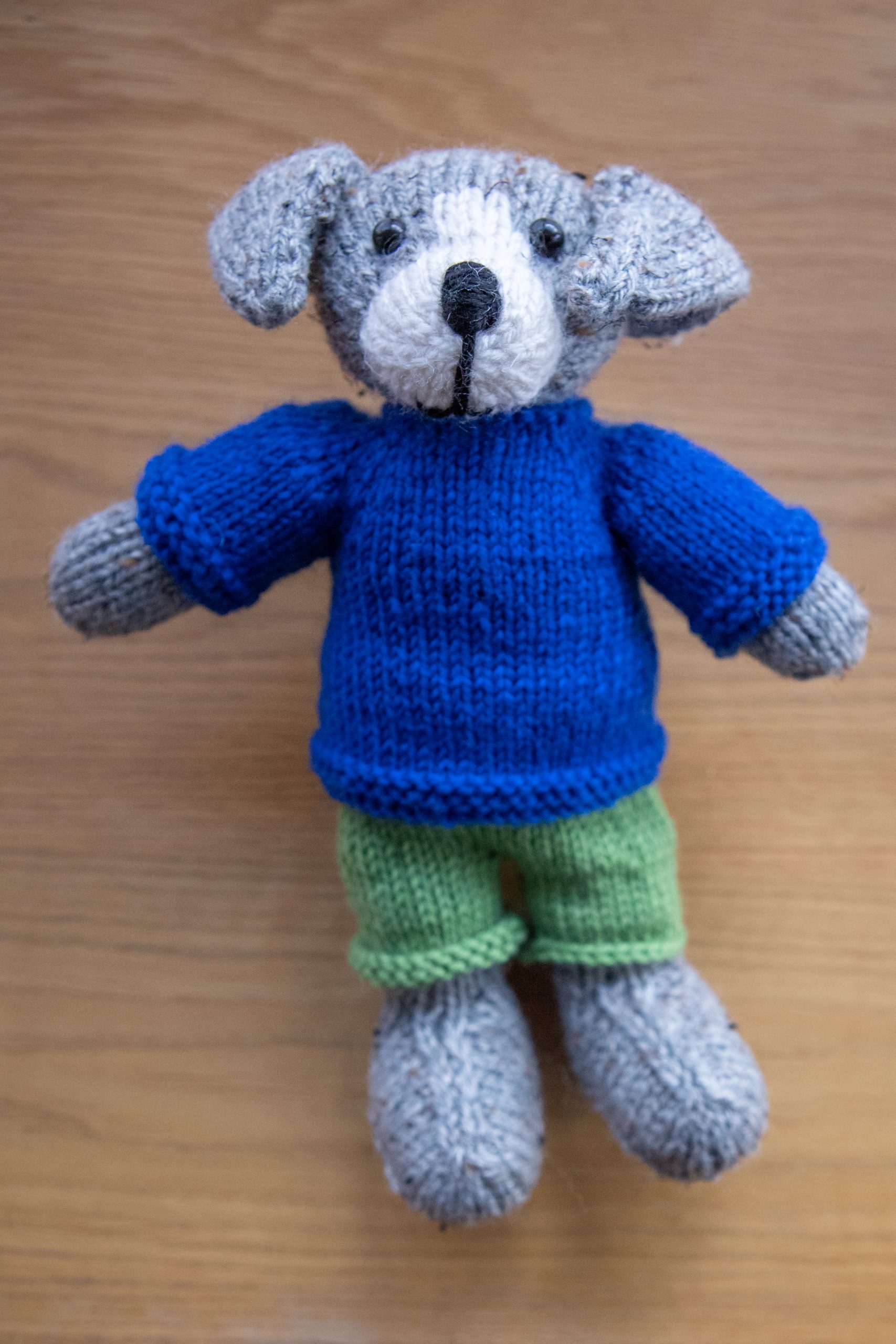 Grár og hvítur hundastrákur í blárri peysu og grænum buxum.