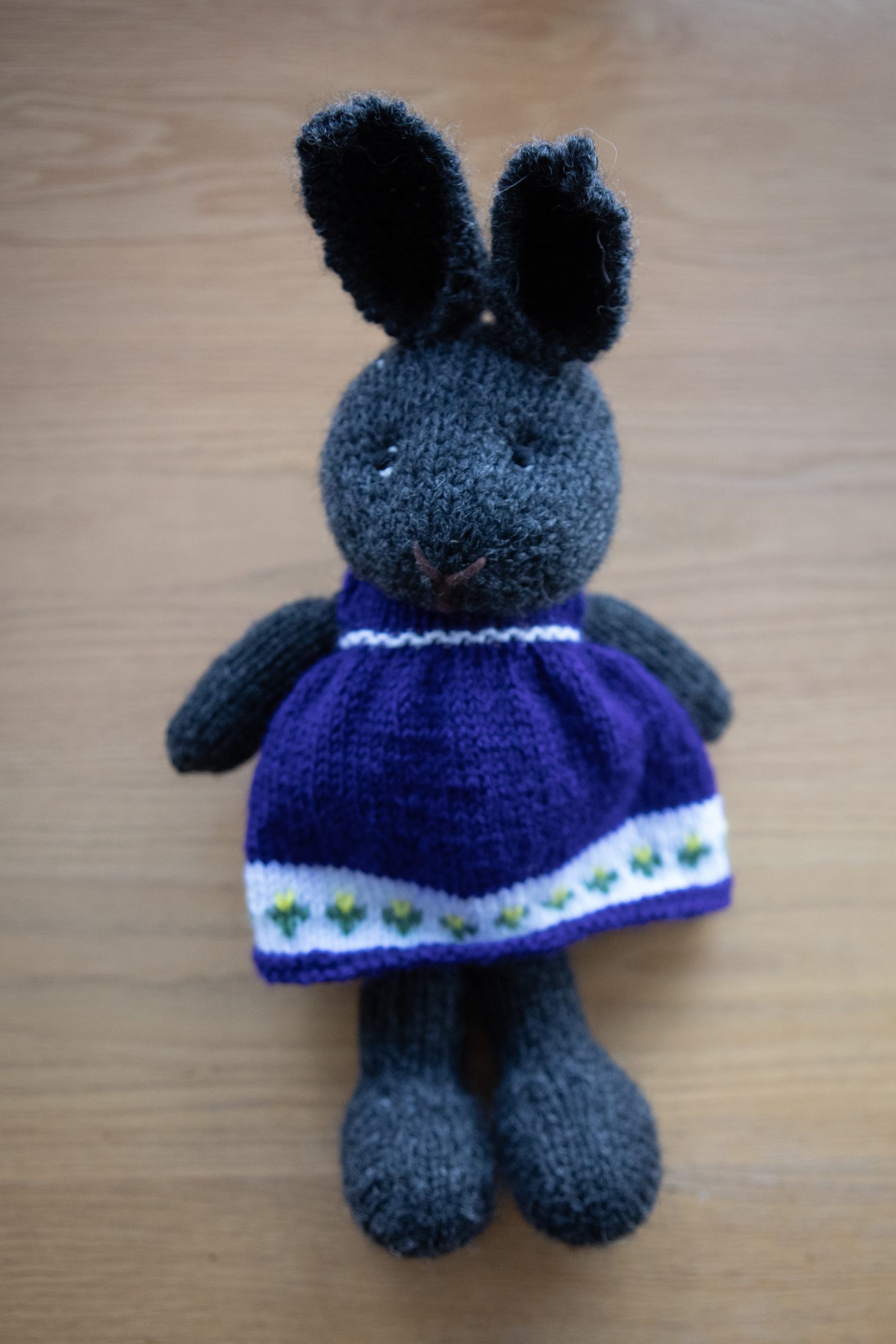 Þessi kanína er prjónuð úr dökk gráugarni. Hún er í útprjónuðum, fjólubláum kjól. Hún er með ísaumuð augu og hentar því börnum á öllum aldri.