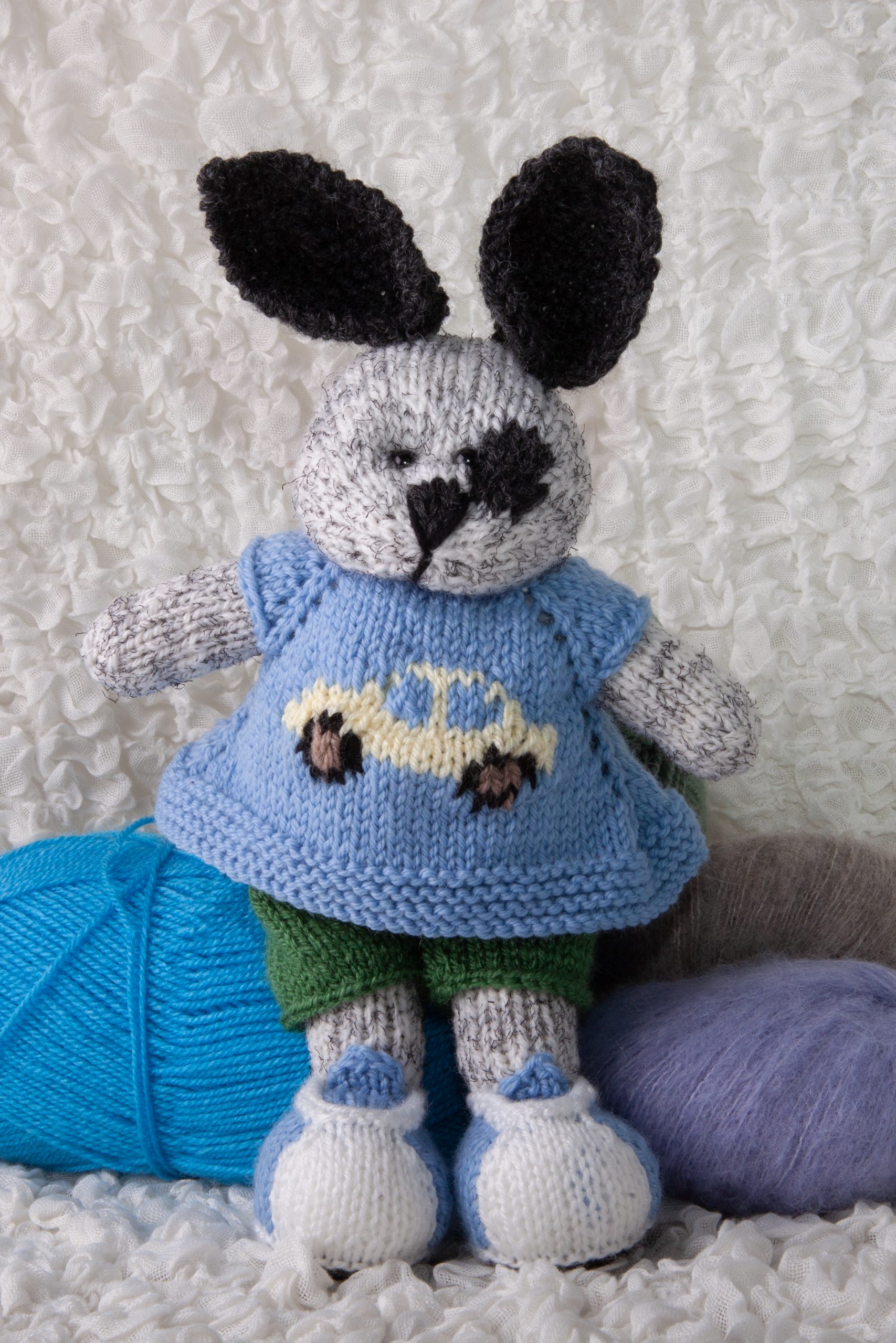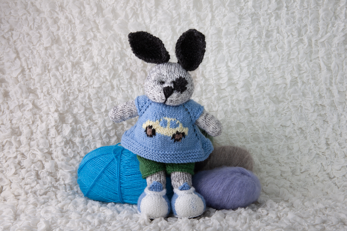 Þessi kanína er prjónuð úr ljósgráu garni. Hún er í útprjónuðaðri, blárri peysu og strigaskóm og grænum stuttbuxum. Hún er með ísaumuð augu og hentar því börnum á öllum aldri. Það er hægt að klæða hana úr peysunni og buxunum en skórnir eru fastir.