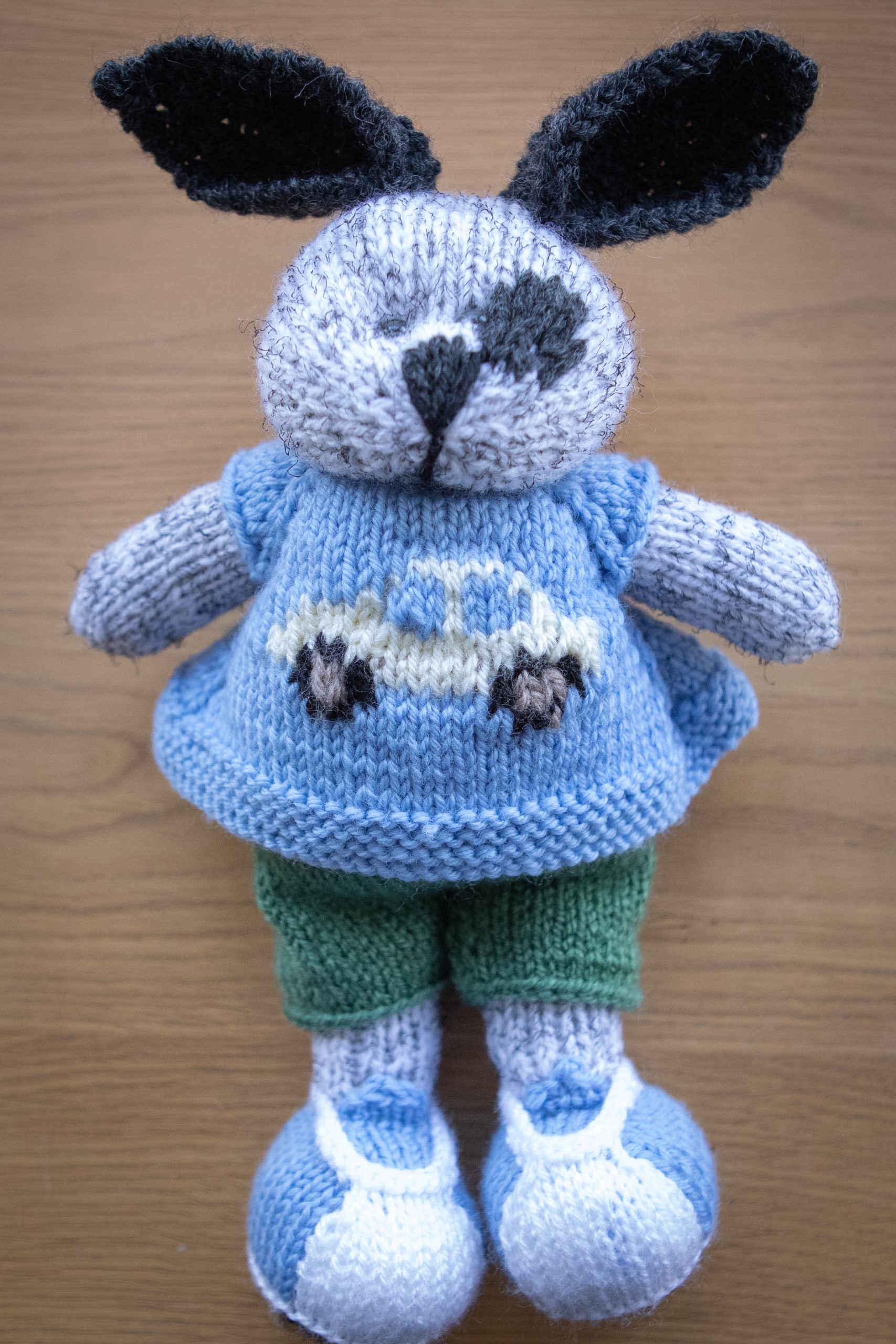 Þessi kanína er prjónuð úr ljósgráu garni. Hún er í útprjónuðaðri, blárri peysu og strigaskóm og grænum stuttbuxum. Hún er með öryggisaugu hentar því ekki börnum undir 3 ára. Það er hægt að klæða hana úr peysunni og buxunum en skórnir eru fastir.