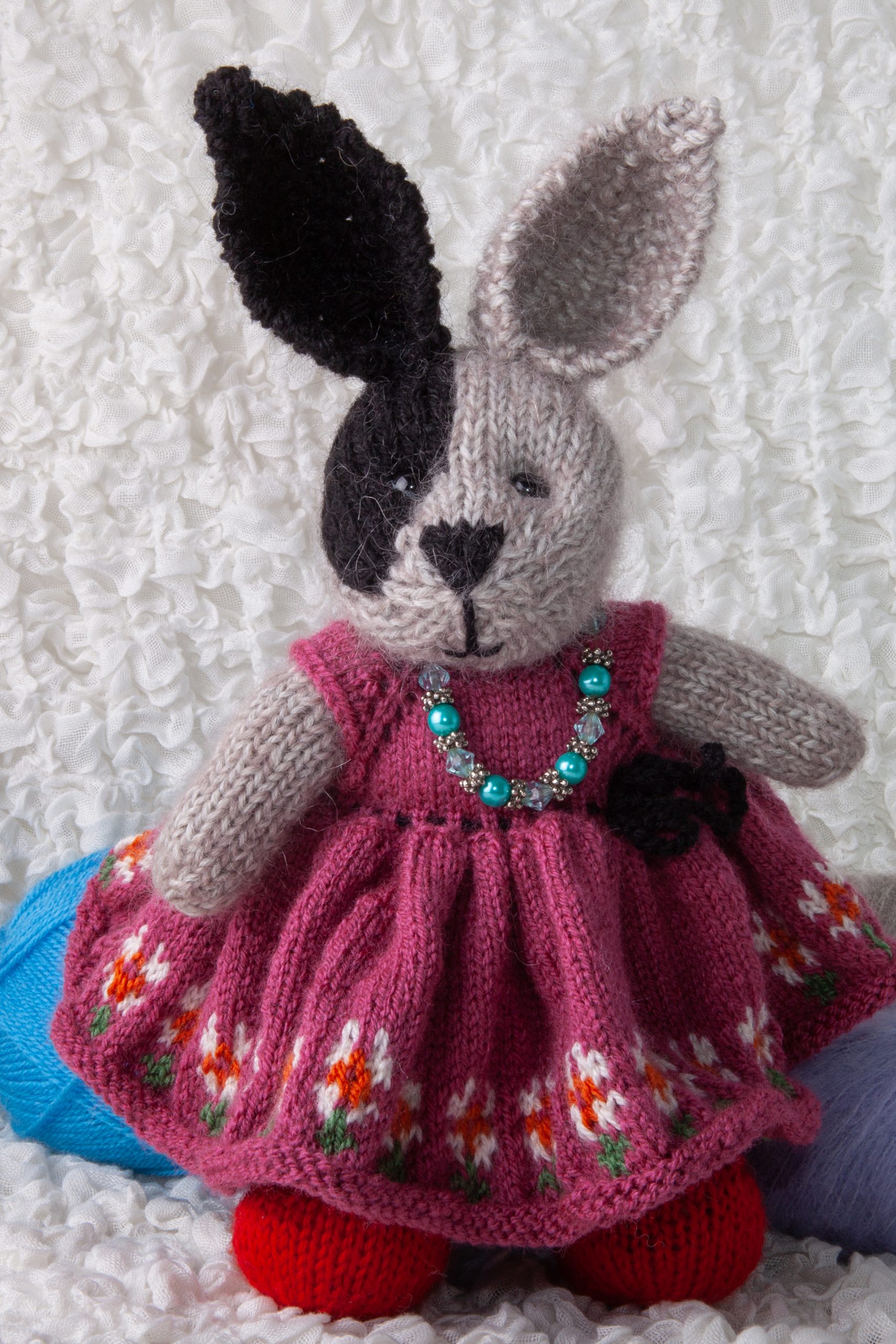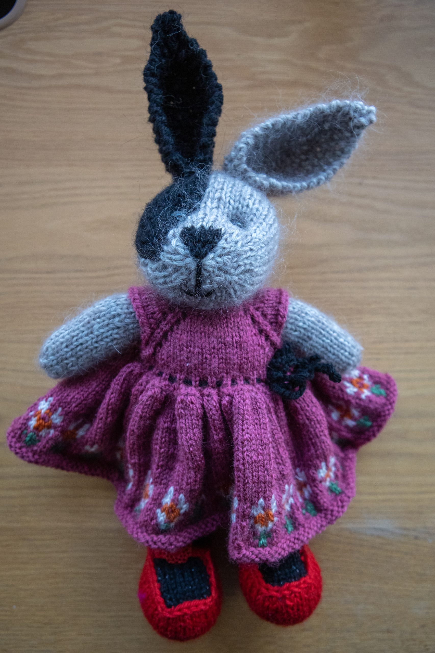 Þessi kanína er prjónuð úr brúnu garni. Hún er í útprjónumðum, vínrauðum kjól, og rauðum skóm. Hún er með öryggisaugu og hentar því ekki börnum undir 3 ára. Það er hægt að klæða hana úr kjólnum en skórnir eru fastir.