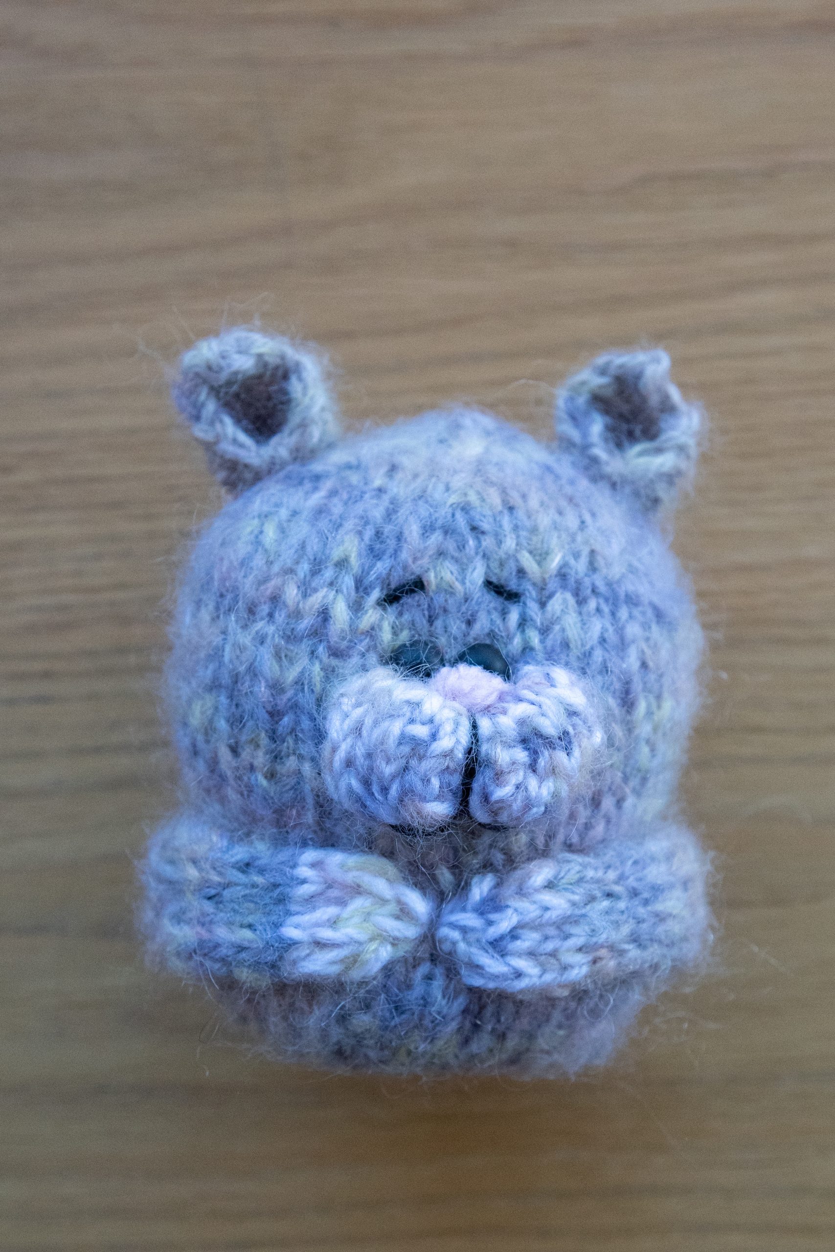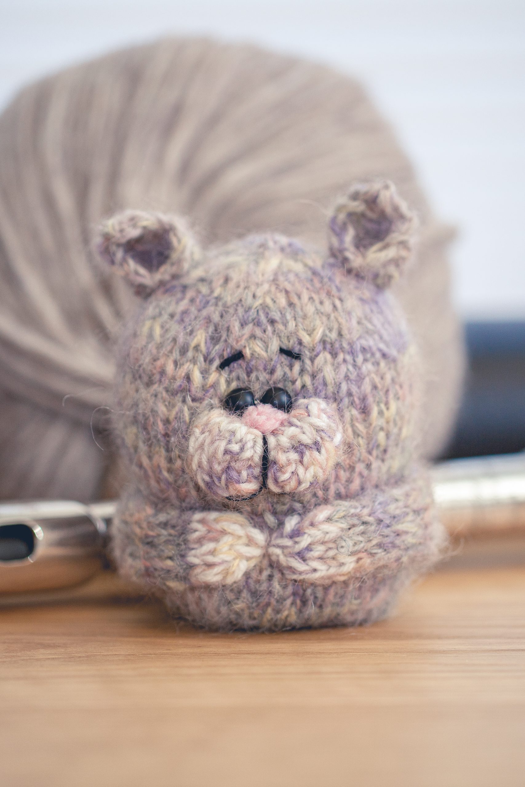 Þessi litla kisa er prjónuð úr marglitu garni með ljósfjólubláum, ljósgulum og gráum tónum. Augun eru svört öryggisaugu úr hörðu plasti.