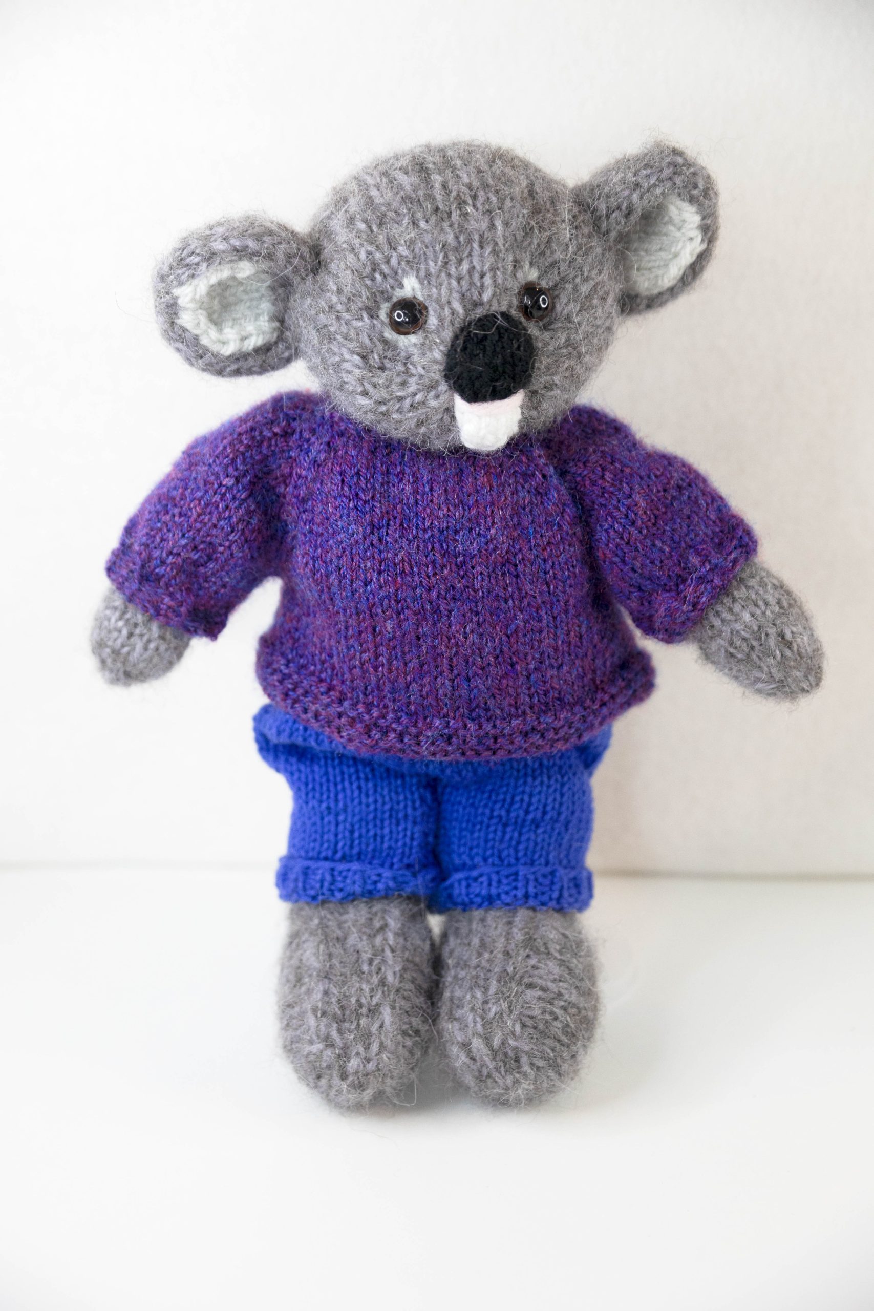 Kóalabjarnarstrákur í fjólublárri peysu og bláum buxum Hægt er að klæða hann úr fötunum. Hann er með öryggisaugu sem hugsanlega gætu losnað og því hentar hann ekki börnum undir 3 ára sem leikfang.