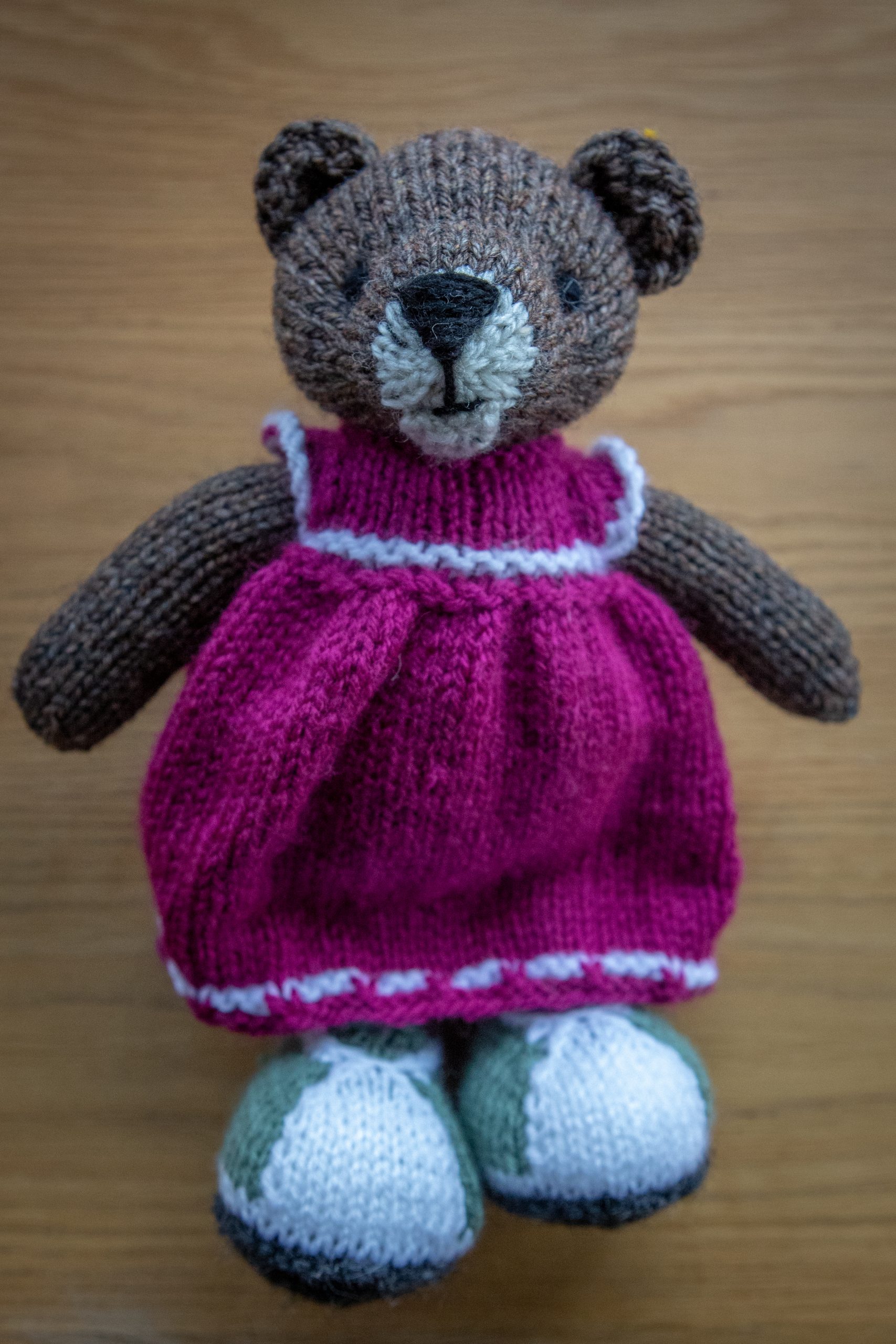 Ljónamamma er í útprjónuðum vínrauðum og hvítum kjól og hvítum og grænum skóm. Það er hægt að klæða hana úr kjólnum en skórnir eru fastir á fótunum hennar. Augun eru saumuð í og eru úr svörtu garni og hentar börnum á öllum aldri.