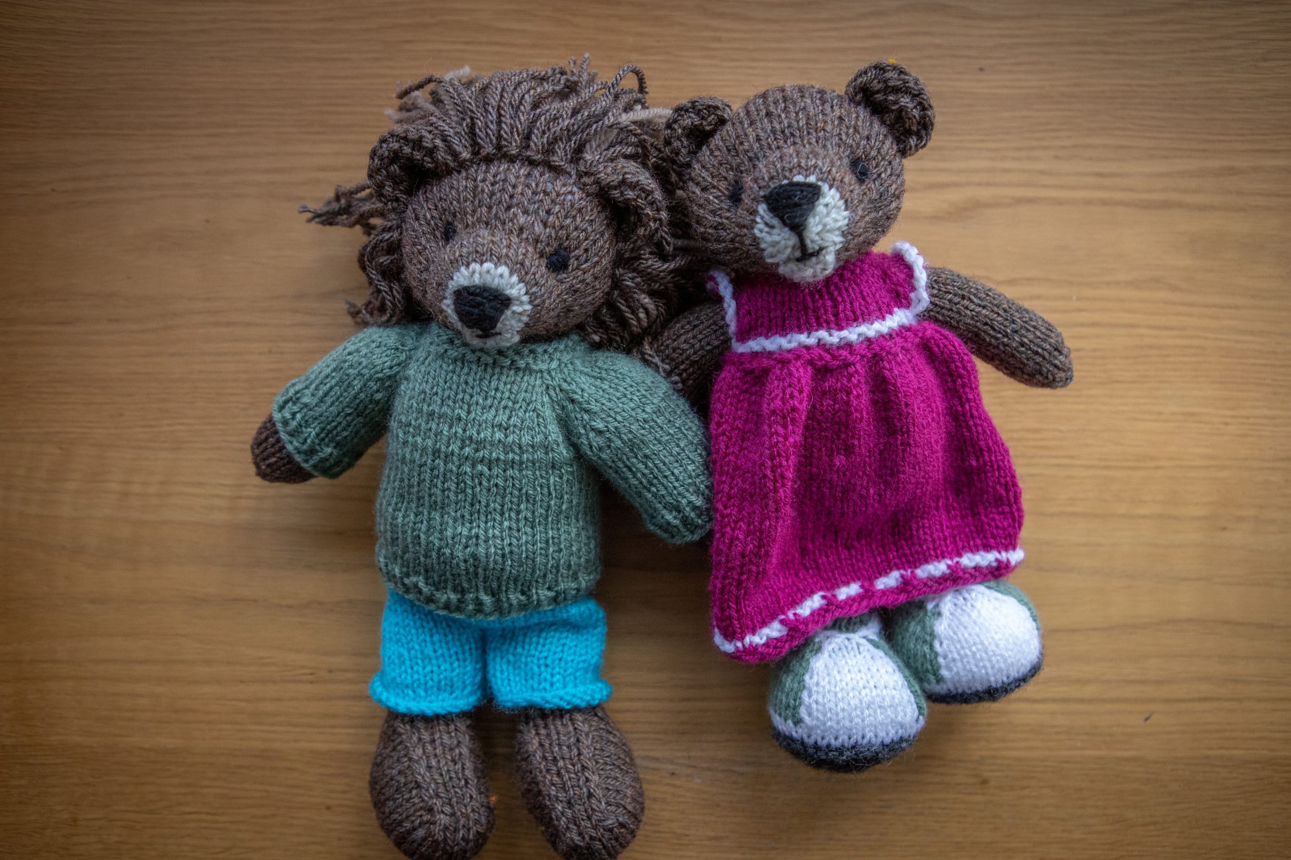 Ljónamamma er prjónuð úr brúnu yrjóttu garni sem er blanda af ull, viskós og akríl. Garnið í trýni og nefi er sama garn og í búknum. Fötin eru prjónuð úr akríl garni.