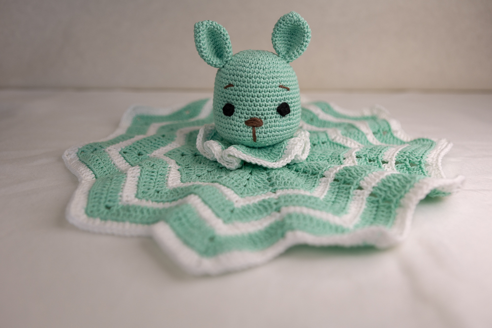 Öryggisvinur heklaður úr grænu og hvítu bómullargarni. Augun eru einnig hekluð og saumuð/bundin föst.