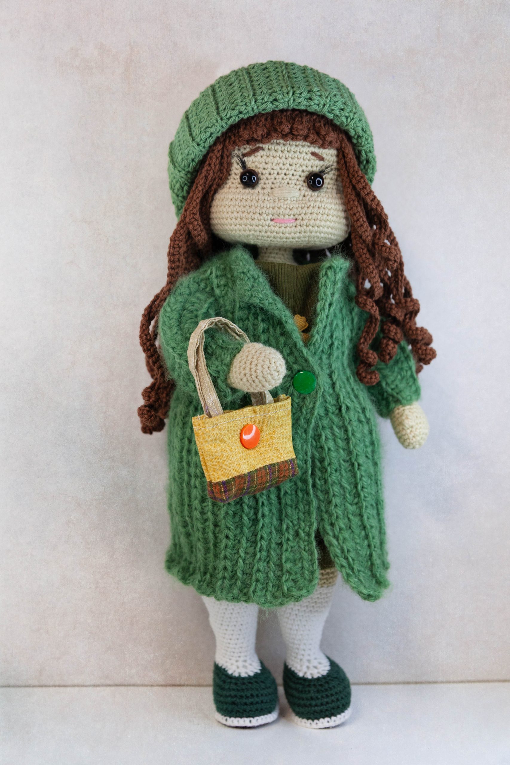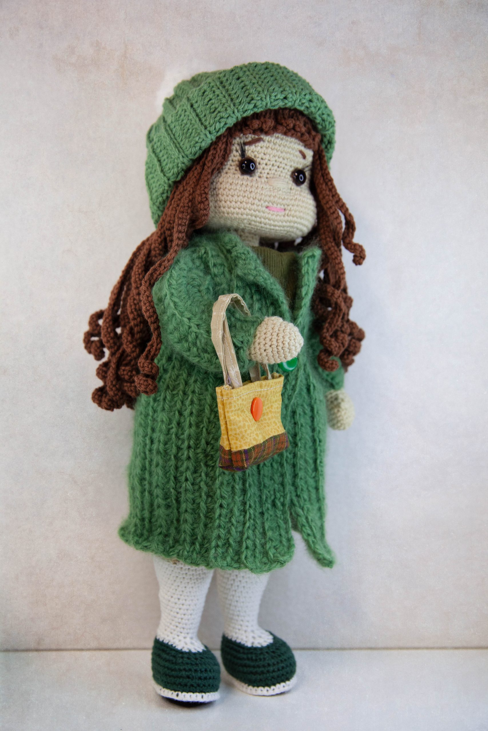 Þessi dúkka er hekluð úr 100% bómullargarni. Hún er með öryggisaugu og gerfiaugnhár. Hún er í þröngum kjól úr bómullar jersey og álímdum blómum. Bæði húfan og kápan eru hekluð úr akríl garni.